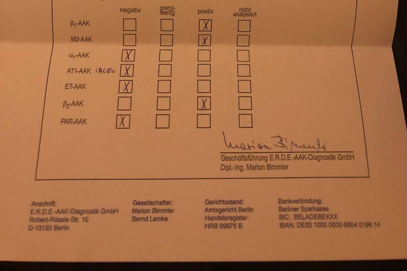 2-3 Tage später völlige Schlaflosigkeit, „elektrische Blitze“ in Kopf und Körper, Erschöpfung, Belastungsintoleranz/PEM und noch vieles mehr (rund 30 verschiedene Symptome). Bei geringer Belastung Zunahme (v.a. der Neuro-)Symptome. Positive AAK