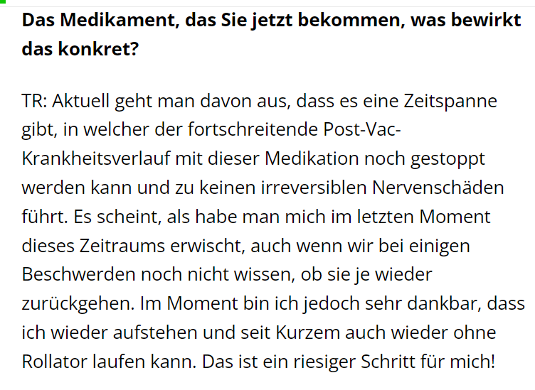 @franzi2022 … genau das hab ich mir auch gedacht… meiner Ansicht nach handelt es sich bei den meisten um eine Überreaktion des Immunsystems. Ich folge da einfach der Ansicht von Frau Prof Dr scheibenbogen die langjährige Erfahrung mit CFS vorweisen kann ( eben auch praktische) und die Charité geht davon aus wenn auch nur 5 % im Monat sich bessert, ist es sehr gut. Ein Satz von dr. S. war dass Post Covid ausheilt wenn es besserungstendenzen gibt. Für mich ist klar dass der Körper auf das Spike Protein reagiert egal ob in echt oder der Impfung . Die Reaktionen sind die gleichen. Natürlich kann ich den Zustand chronifizieren, aber das kann ich mit jedem gebrochenen Bein auch, wenn ich keine Ruhe gebe. Das pacing ist nun mal das wichtigste und damit haben die allermeisten auch Erfolg. Natürlich müssen akute Virusinfekte wie EBV ect erstbehandelt werden (so weit es möglich ist) bevor sich das Immunsystem wieder beruhigen kann. Wenn das der Fall ist muß sich das Nebensystem beruhigen und stabilisieren. Und das kann man selbst beeinflussen. Viele hier sind leider in dieser Phase überfordert mit Kind und Beruf. Aber es ist extrem wichtig sich jede Hilfe zu holen die möglich ist, damit man sich um sich selbst kümmern kann. Es ist wichtig die Heilung an oberste Stelle zu setzen. Ein Augen zu und durch wird nicht funktionieren. Fr. Retzlaff ist ziemlich engagiert und hat viel auf die Beine gestellt, aber ich denke nicht dass sie sehr auf sich selbst acht gegeben hat. Ich denke nicht dass sie mit der Behauptung Recht hat, dass die Zeit davon läuft, dass zeigen auch die vielen Recovery Beispiele bei CFS, auch erst nach 2/3 Jahren. Natürlich durch Pacing und Ruhe erreicht!!!