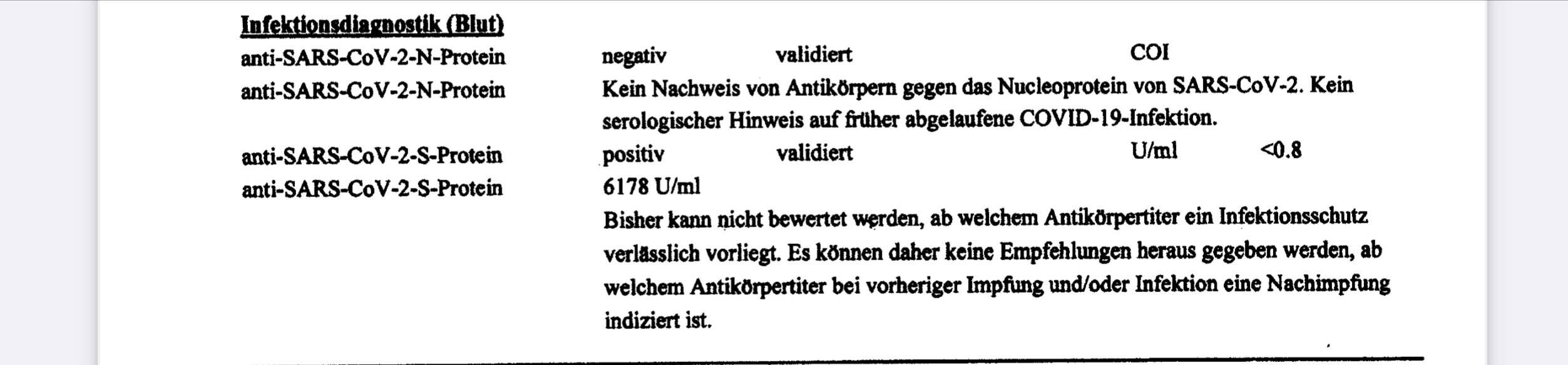 Bei einer natürlichen Infektion entsteht das Anti-SARS-CoV-2-N-Protein. Bei mir negativ, also kann eine natürliche Infektion ausgeschlossen werden.