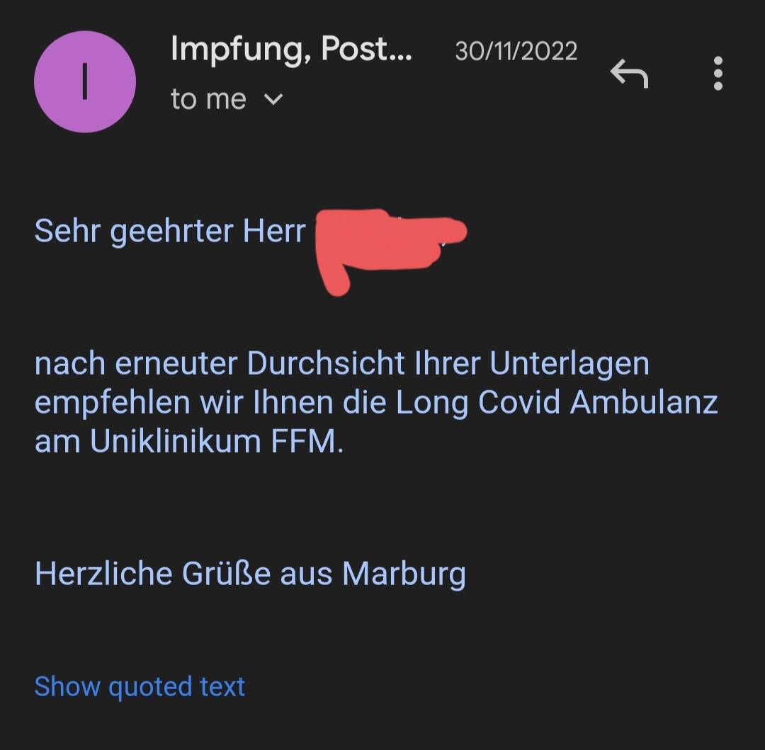 @mark mag sein, aber ist die Einschätzung der Schwere der Erkrankung anhand einer Symptomauflistung in einer Email klingt nicht gerade professionell. Ich persönlich bekam von denen als Antwort auch nicht einen link zu seinem paper voller Werkzeuge, sondern wie gesagt nur die vollkommen umnächtigte Empfehlung, zur lokalen long covid ambulanz zu gehen. Alsob Ich das nicht a) bereits erfolglos probiert hätte und b) denen nicht bereits vorher mehrfach geschrieben hätte, dass ich da ohne pcr+ nicht reinkomme.