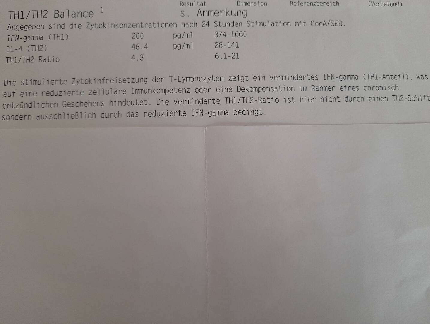 meine Werte sehen auch sehr ähnlich aus. Das Interferon gamma steigt an wenn Entzündung da ist. TH 1 steht für Entzündung und Autoimmunität, TH 2 für Allergie-mal ganz grob. Das TH1 es niedrig ist heißt das es sich hier vermutlich -weitere Werte wären hilfreich, um eine Hypo und nicht eine Hyperinflammation handelt. Ich verstehe es so, dass wahrscheinlich die TH 1 Achse samt Ihrer Werte sinkt eben weil das Immunsystem an dieser stelle kapituliert. Wichtig ist auf keinen Fall antientzündlich zu arbeiten. Antientzündlich ist eben auch immer immunsuppressiv. Und Entzündungen sind grundsätzlich eine überlebenswichtige Immunreaktion. Schwierig wird es erst wenn ein chronisches oder extrem starkes Geschehen auftritt.
