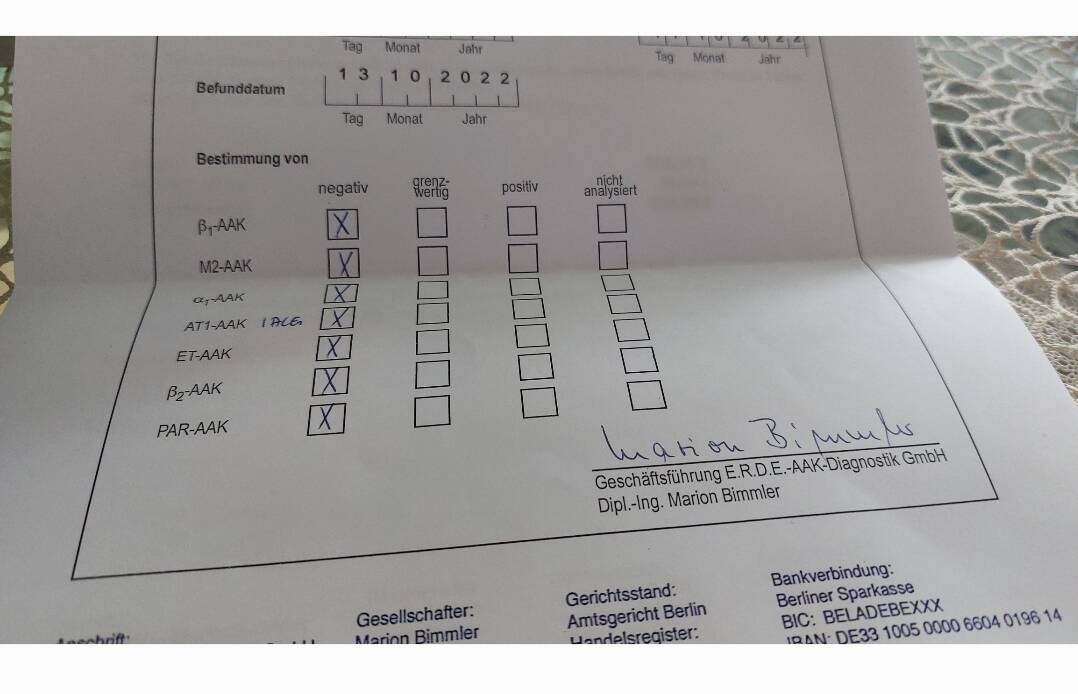 2te moderna 06.10.2021, seit dem: Herzrasen, jetzt (August) selten, herzstolpern, nachtschwitzen nicht mehr da, schlafstoerungen, kribbeln, MUSKELNZUCKEN als nervigste Beschwerde, weil mit viel Angst verbunden durch googeln, klinisch nicht bestaetigte Schwäche im li arm, eisenmangel(im griff), um die Hälfte reduzierten leukozyten seitdem aber stabil sogar Verbesserung ! Echokardiohrafie: im November nichts, im Februar Korona, im Juni; Mitral und Trikuspidalklappeninsuffizienz leichtes Grades, ekgs, holter ohne Befund, Kopf und Hals MRT : vereinzelten gliosenherde als unauffällig eingestuft, crp immer ok, nadelemg unauffällig bis fascykulationen-befund BFS.