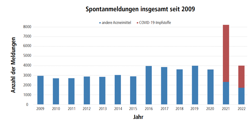 „Im Jahr 2022 erhielt das Paul-Ehrlich-Institut 113.761 Verdachtsfallmeldungen zu COVID-19-Impfstoffen, dagegen nur 3.771 Verdachtsfallmeldungen zu allen anderen Impfstoffen und weitere 3.217 Verdachtsfallmeldungen zu allen anderen Arzneimitteln im Zuständigkeitsbereich des Paul-Ehrlich-Instituts (ebenfalls Stand Februar 2023)“.