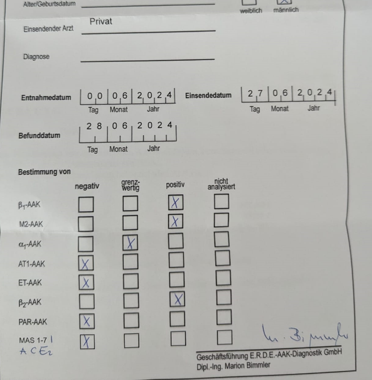 Fr. Bimmler hat mir am Telefon versichert, dass es von den AAK kommt und das meine Symptome passen und ich soll nun die Spikes testen, um überhaupt eine Chance zu haben, mich bei Prof. Matthes vorzustellen. Denn dieser behandelt Symptome, aber nur wenn die AAKs sowie Spikes vorliegen.