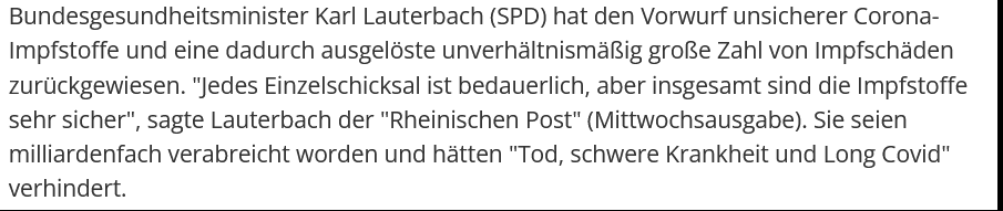Lauterbach: Jedes Einzelschicksal ist bedauerlich. Aber insgesamt sind die Impfstoffe sehr sicher. Sie wurden milliardenfach verabreicht, haben Tod, schwere Krankheit und Long Covid verhindert. Der Nutzen der Impfung ist im Vergleich zu auftretenden Nebenwirkungen riesig.