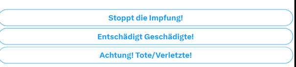 Aber: Das Motto gefällt mir nicht ( alle 3 Varianten ) - zu allgemein, ich bin z. B. nicht dafür, alle Impfungen zu stoppen. Geschädigte gibts viele, nicht nur durch Covid-19-Impfung und Verletzte und Tote gibts auch z. B. im Straßenverkehr.