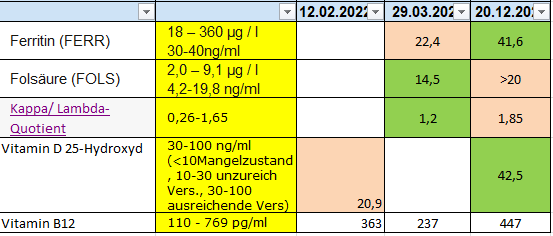 Die einzigen Blutwerte die am unteren Referenzbereich lagen waren Vitamin D25, Ferritin, Folsäure, Vitamin B12