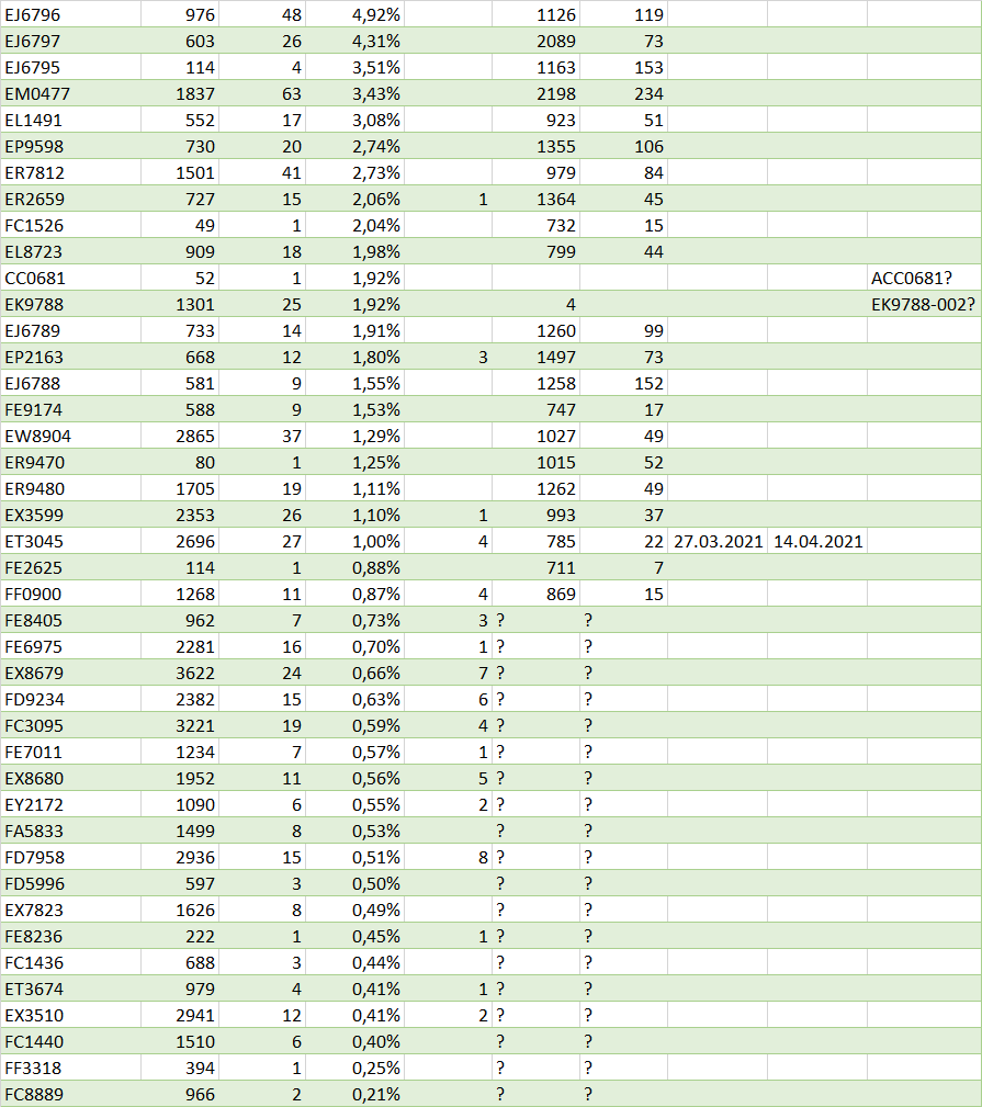 Allerdings gibt es viele Chargen, die nur 1 oder 2 Meldungen haben, möglicherweise also sehr klein waren und bei denen 1 Todesfall natürlich bei dieser Methode hoch einschlägt mit 50 % oder 100 % Todesquote. Dias sind aber nicht die Chargen, die uns interessieren. Wir sind ja alle mit großen Chargen geimpft worden.