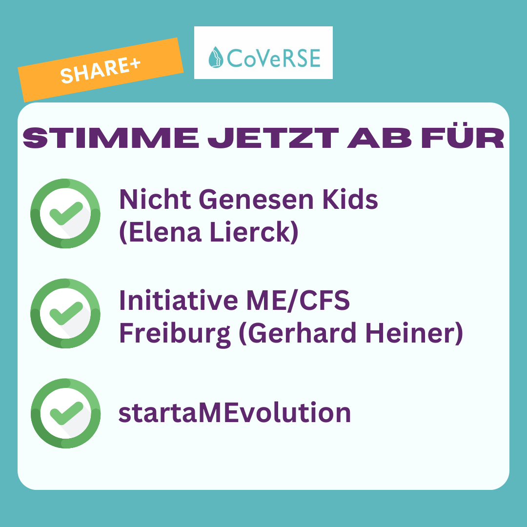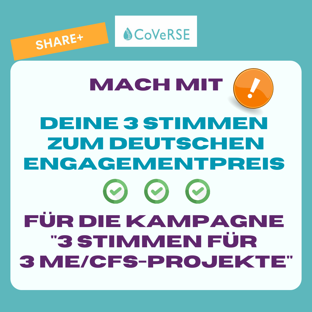 Wir von CoVeRSE unterstützen die Kampagne „3 Stimmen für 3 ME/CFS-Projekte" bitten Euch um Eure Stimmen für mehr Sichtbarkeit für ME/CFS, Post Vac, Post Covid.