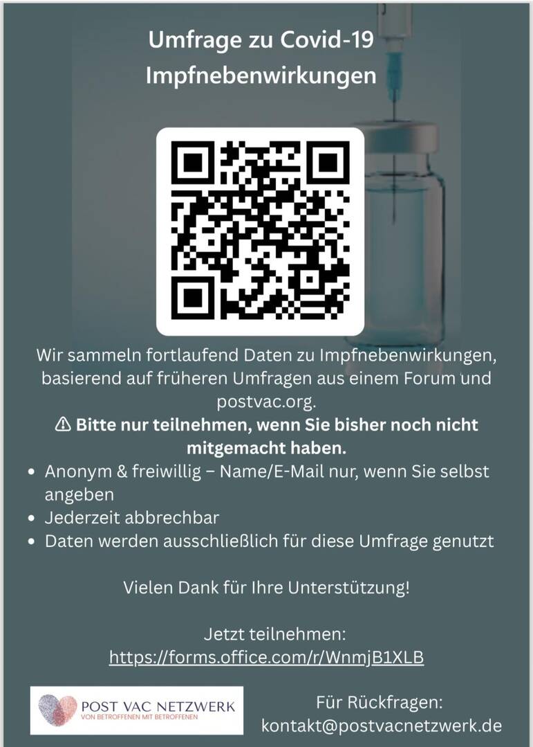 Vielen Dank, dass Sie an unserer Umfrage teilnehmen. Ihre Angaben werden gespeichert und nur für diese Datensammlung verwendet. Sie können jederzeit abbrechen. Diese Umfrage wurde durch das Post Vac Netzwerk in Anlehnung an die Datensammlung von postvac.org gestartet.